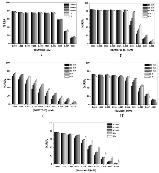 Looking at how the RSA capacity of compounds is modified with time (Figure 1), resveratrol (right graph) maintained the RSA capacity at concentrations above 0.5 mM. However, at lower concentrations the RSA percentages clearly diminished as a function of concentration, but increased with time (RSA 2h > RSA 10 min). In our case, compound 8, shows this time-dependent behavior already from high concentrations (Figure S2). However, compounds 3, 7 and 17 maintained the RSA ability nearly at the same percentage levels, independently on time, until quite low concentrations, 0.031, 0.063 and 0.25 mM, respectively, which is a remarkable difference with resveratrol (Figure 1). This behavior of 3, 7 and 17, will allow the use of low concentrations of sample for achieving a high effect. On the other hand, like for resveratrol, and with the exception of compound 3, at the low concentration of 0.031 mM for 7 and 17, the RSA ability increased with time (Figure 1).
