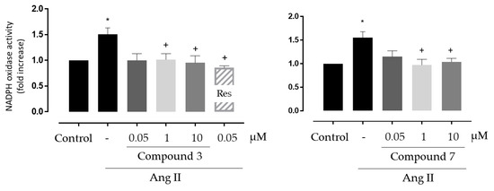 Effect of compounds 3 and 7 on Nicotinamide Adenine Dinucleotide Phosphate (NADPH) oxidase activity induced by Angiotensin II (Ang II) in cultured human microvascular endothelial cells. * p < 0.05 vs. control, + p < 0.05 vs. Ang II. Res: resveratrol (dashed bars) was used as positive control. N = 8 for compound 3 and n = 7 for compound 7.