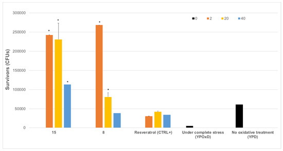 Saccharomyces cerevisiae survivors (mean CFUs (colony forming units) ± SEM) to oxidative stress after treatment with compounds 15 and 8. Yeast cells were subjected to oxidative stress by growing in YPOxD medium, after 16h, cells were subjected to treatment with different doses (2, 10, 20 or 40 μg, check color code in legend) in triplicate, and after 60 h of growth monitorization by OD600 measurement in Bioscreen c, cells were serially diluted in 10% glycerol and plated in YPD medium plates, to determine number of CFUs per ml. Stressed yeasts without antioxidant treatment (under complete stress (YPOxD)), non-stressed yeasts (no oxidative treatment (YPD)) and stressed yeasts treated with resveratrol (resveratrol (CTRL+) were also included. Statistical significance (F-test with p-value lower than 0.05) was assessed first between YPOxD and YPD yeast survivors; and then between YPOxD stressed and antioxidant-treated, followed by comparison between control antioxidant (Resveratrol) and tested compounds at each dose. Asterisk indicates statistically significant comparisons (alpha = 0.05).