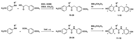 The methoxyphenyl amide derivatives 19 to 28 were prepared by reaction of the conveniently substituted aniline and the corresponding phenylacetic acid, in CH2Cl2, using 1-ethyl-3-(3-dimehylaminopropyl) carbodiimide (EDC.HCl) and 1-hydroxybenzotriazole (HOBt) as coupling agents, in the presence of N,N-diisopropylethylamine (DIEA) as a base. Further treatment of methoxy-substituted intermediates 19 to 28 with BBr3 led to the desired hydroxylated amides, compounds 1 to 10 (Scheme 1). On the other hand, the preparation of the ureido compounds 29–36 was carried out from the corresponding methoxyanilines and the methoxy-substituted isocyanates, by reaction at room temperature in tetrahydrofuran (THF) (Scheme 1). The final hydroxyl derivatives (11 to 18) were prepared from 29 to 36 also by demethylation reaction with BBr3. The synthesis proceeded very smoothly and most compounds were obtained in moderate-to-good yields with elevated grade of purity (Table 1 and Table 2). The acylation reaction was especially difficult in the case of the secondary bis-4-methoxyphenylamine to obtain methoxy amide 27, and during the urea formation of intermediate 36. Low yields in some demethylation reactions seem to be related to low stability of the final polyhydroxylated compounds (as explained later).