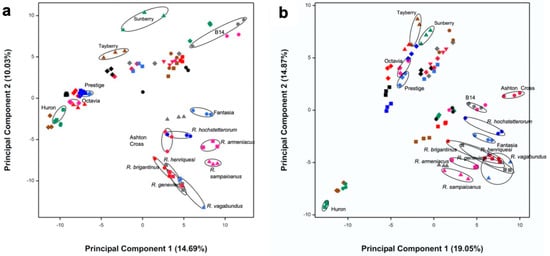 Principal component analysis (PCA) plots of the first two principal components (PCs) for the untargeted analysis acquired in positive (a) and negative (b) modes. These plots illustrate the phytochemical diversity present within the Rubus germplasm collection analyzed which included 36 species/cultivars. In positive mode, it was possible to identify three major groups comprising black and red raspberries (negative values for principal component 1, PC1), hybrid berries (high positive values for principal component 2, PC2), and wild and some domesticated blackberries (positive for PC1 and negative for PC2). In negative mode, three main groups were also observed, although they comprised black raspberries (negative for PC1 and PC2), red raspberries and hybrid species (high positive values for PC2), and wild and domesticated blackberries clustering with some hybrid species (positive values for PC1). The species selected for evaluation of bioactivity are circled in both plots.