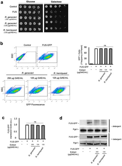 Mechanistic studies were performed and suggest that R. genevieri (poly)phenolics led FUS to be trapped into insoluble intracellular structures thereby reducing its pathological activity. This is a well-known route of cellular protection against the toxic effect of several oligomerization-prone proteins described for several diseases []. It remains to identify the major molecular players in this process and to evaluate whether this mechanism is conserved in higher eukaryotes.