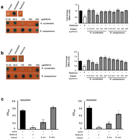 Mitigation of the pathological interaction between RAS and RAF by R. occidentalis (var. Huron). SKY197 recombinant cells expressing ADH1pr-λCI-RAS GAL1pr-B42-BRAF from 2µ vectors were pre-grown in synthetic dropout raffinose medium and exposed or not to the indicated concentrations of phenolic compounds-enriched extracts. Radicicol was used as a positive control. Cells containing the empty vectors were used as control. KRAS/BRAF (a) and HRAS/BRAF (b) interaction was assessed by monitoring β-galactosidase activity in SD galactose medium using 5-Bromo-4-Chloro-3-Indolyl β-d-Galactopyranoside (X-Gal) (left panels) and 2-Nitrophenyl β-d-galactopyranoside (ONPG) (right panels). (c) RAS/RAF interaction assessed by monitoring the final biomass of cell cultures grown in SD galactose medium without lysine and supplemented with 125 µg GAE/mL of the indicated phenolic compounds-enriched extracts. Representative images are shown, and the values represent the mean ± SEM of at least three biological replicates, * p < 0.05, ** p < 0.01, *** p < 0.001. R. occ.—R. occidentalis; R. sam.—R. sampaioanus.
