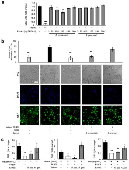 Attenuation Crz1 activation by Rubus occidentalis (var. Huron). BY4741 yeast strains encoding CRZ1promoter–lacZ or CRZ1–GFP were subjected or not to the indicated concentrations of phenolic compounds-enriched extracts and induced with 1.8 mM MnCl2. (a) Crz1 activation was assessed by monitoring β-galactosidase activity using 2-Nitrophenyl β-d-galactopyranoside (ONPG). (b) Crz1 subcellular dynamics evaluated by fluorescence microscopy in cells treated with 125 µg GAE/mL of the indicated phenolic compounds-enriched extracts. (c) Activation of Crz1 target genes PMR1, PMC1, and GSC2 in cells treated as above by means of qRT-PCR. The immunosuppressant FK506, which inhibits calcineurin and prevents Crz1 activation, was used as a positive control. Representative images are shown, and the values represent the mean ± SEM of at least three biological replicates, * p < 0.05, ** p < 0.01, *** p < 0.001.