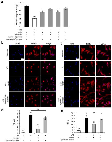 The NF-kB pathway represents a central pathway in inflammatory responses, and the NF-kB regulatory activity is also controlled at the level of subcellular localization. Thus, the anti-inflammatory potential of cyanidin and cyanidin-3-O-glucoside towards p65, a subunit of the NF-kB complex, was further investigated in cells pre-treated with both compounds before stimulation with LPS. Similar to NFATc1, both compounds prevented p65 nuclear accumulation (Figure 5c). Notably, only cyanidin aglycone mediated a significant decrease of nitric oxide levels and TNF-α release (Figure 5d,e).