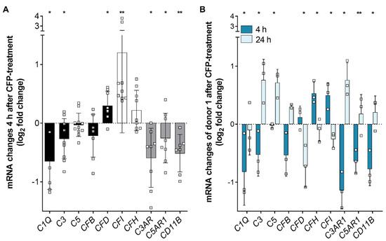Complement regulator properdin changed complement mRNA expression in stressed hpRPE cells. (A) H2O2 stressed hpRPE cells were treated with properdin (CFP) for 4 h. mRNA expression of main complement components C1Q, C3, C5, and CFB (black) as well as complement receptors C3AR, C5AR1, and CD11B (grey) was decreased in comparison to stressed cells (dotted line). CFD (black) and complement regulators CFI and CFH (white) mRNA expression was increased in stressed, properdin-treated cells compared to stressed cells only. Data from donors 1–4 are presented. Mean with standard deviation is shown. * p < 0.05, ** p < 0.01 unpaired t-test with Welch‘s correction of stressed versus stressed, properdin-treated cells. (B) H2O2 stressed hpRPE cells of donor 1 were treated with properdin for 4 h (dark blue) or 24 h (light blue). mRNA Expression of complement components and receptors was reversed after 24 h compared to 4 h. Mean with standard deviation is shown. * p < 0.05, ** p < 0.01 unpaired t-test with Welch‘s correction of 4 h versus 24 h properdin treatment.