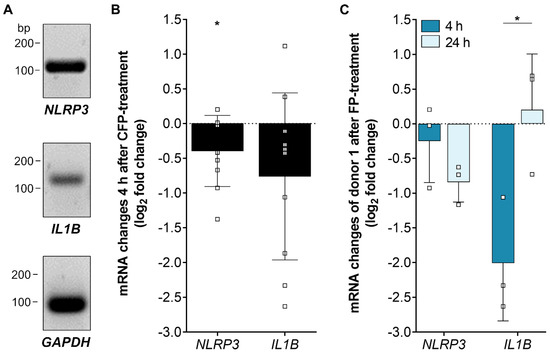 mRNA was isolated using the NucleoSpin® RNA kit (Macherey-Nagel, Düren, Germany, #740955) and transcribed into cDNA with the QuantiTect® Reverse Transcription Kit (Qiagen, Hilden, Germany, #205313). Transcripts of complement components, regulators, receptors and inflammation-associated markers were analyzed (i) by PCR (as described in Section 2.2.) and subsequent 2% agarosegel separation for cDNA fragment visualization, or (ii) by qPCR using Rotor-Gene SYBR® Green PCR Kit (Qiagen) in a Rotor Gene Q 2plex cycler (Qiagen) either with QuantiTect Primer Assays (Qiagen, Table S2), or in-house designed primers for IL1B, VIM and SMA1 (Metabion, Planedd, Germany, Table S1). Data were normalized to the housekeeper GAPDH expression and fold change was calculates using 2(-Delta Delta C(T)) method [40]. Data are visualized on a linear scale using log2-transformed scores [41].
