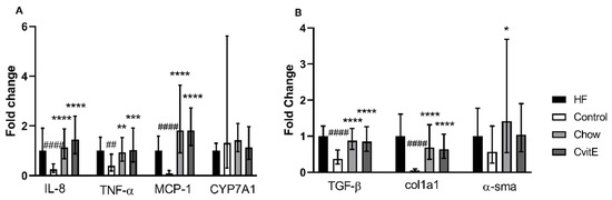 Expression of key target genes. (A) Expression of inflammatory target genes (IL-8, TNF-α and MCP-1) showed a significant downregulation in the Control group compared with HF. Furthermore, expression levels in Chow and CvitE were significantly elevated compared with Control, while no difference compared to HF was detected. CYP7A1 expression levels did not show any difference between groups. (B) Expression of the fibrotic target genes TGF-β and Col1a1 showed significant downregulation in the Control group compared with HF, while chow and CvitE showed significant upregulation compared with Control with no difference to HF. In the expression of α-sma, Chow was significantly upregulated compared with Control. Moreover, the Control group appeared downregulated compared with HF and CvitE although not reaching significance. * p < 0.05, ** p < 0.01, *** p < 0.001, **** p < 0.0001, compared with Control; ## p < 0.01, #### p < 0.0001, compared with HF. IL-8, interleukin 8; TNF-α, tumor necrosis factor α; MCP-1, monocyte chemotactic protein 1; CYP7A1, cytochrome P450 7A1; TGF-β, transforming growth factor β; Col1a1, collagen 1a1; α-sma, α smooth muscle actin.
