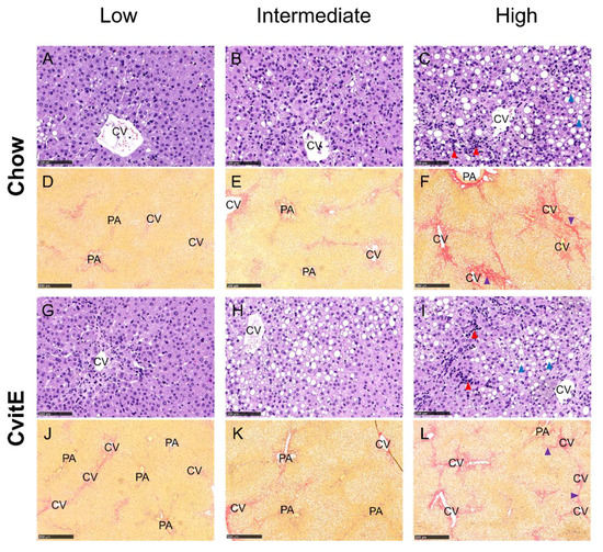 Representative histological images of liver sections at study termination. Panels are divided into subgroups: low (inflammatory score 0); intermediate (inflammatory score 1) and high (inflammatory score 2–3). (A–C,G–I) Hematoxylin and eosin stain, scale bar 100 µm. (D–F,J–L) Picro Sirius red stain (fibrosis stained red), scale bar 500 µm. The histological images show the pathological lesions associated with NASH: steatosis (macro and micro vesicular) (blue arrowheads), lobular inflammation (red arrowheads) and bridging fibrosis (purple arrowhead). Ballooning hepatocytes were also assessed, however cannot be identified at this magnification. CV, central vein; PA, portal area.
