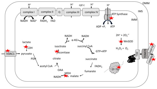 Redox proteomics identified oxidatively modified, mitochondrial proteins in brains from persons with Alzheimer disease or amnestic mild cognitive impairment. Proteins marked with a red star are oxidatively modified. Functional classes of oxidatively dysfunctional proteins include those related to: Glucose metabolism, i.e., lactate dehydrogenase (LDH), aconitase, malate dehydrogenase (MDH), ATP synthase; Export of anions (ATP, for example, has a decreased chance of export through voltage-dependent anion channel 1 (VDAC1) to drive neuronal function including the maintenance of mitochondrial potential); Free radical scavenging (MnSOD, which increases opportunities to cause further oxidative and nitrosative damage to mitochondria); mitochondrial protein synthesis (EF-Tu, which would lead to altered levels of key proteins needed to assemble into functional inner membrane resident electron transport complexes and thereby decrease ATP levels); and chaperone and transport function for the import of nuclear-encoded proteins into mitochondria (heat shock protein 70 (HSP70); heat shock protein 90 (HSP90), which also could contribute to altered protein levels of needed electron transport chain [(ETC) complexes and other key proteins]. See text for further details.