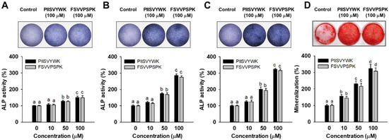 Effect of PIISVYWK and FSVVPSPK on ALP (alkAline Phosphatase) activity after incubating for (A) 3, (B) 7, and (C) 14 days and on (D) mineralization after incubating for 21 days in mBMMSCs (Murine bone marrow mesenchymal stem cells). Cells were treated with ODM (osteogenic differentiation medium) containing two peptides (0, 10, 50, and 100 μM) for the indicated incubation time. ODM was changed every 2 days. ALP staining and mineralization images are represented by the image at 100 μM. Results are shown as the mean ± S.D. with three determinations. a–d Bars with different letters indicate a significant difference at p < 0.05.