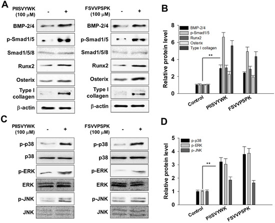 It is known that the MAPK signaling pathway is involved in the proliferation and differentiation of osteoblasts. Thus, to investigate the osteogenic effect of PIISVYWK and FSVVPSPK in mBMMSCs associated with MAPK signaling pathways, phosphorylated forms of p38, ERK, and JNK were assessed by Western blot analysis. As shown in Figure 2C,D, PIISVYWK and FSVVPSPK treatment activated phosphorylation of three MAPK molecules—p38, ERK, and JNK. These results indicate that differentiation of mBMMSCs into osteoblast by PIISVYWK and FSVVPSPK treatment was achieved through activation of BMP and MAPK signaling.