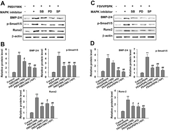 Effect of MAPK inhibitors on PIISVYWK and FSVVPSPK-mediated osteogenic differentiation (A–D). Cells were treated with three MAPK inhibitors including SB203580 (SB, 10 μM), PD98059 (PD, 20 μM), and SP600125 (SP, 10 μM) for 2 h prior to treatment with PIISVYWK and FSVVPSPK and incubated for 7 days. ODM (osteogenic differentiation medium) was changed every 2 days. Western blot analysis was performed and analyzed band density by Image J software. The expression of each target protein was calculated as the relative expression to β-actin. Results are shown as the mean ± S.D. with three determinations. ** p < 0.01 vs. control group (0 μM of peptide); # p < 0.05 and ## p < 0.01 vs. peptide treatment group only.