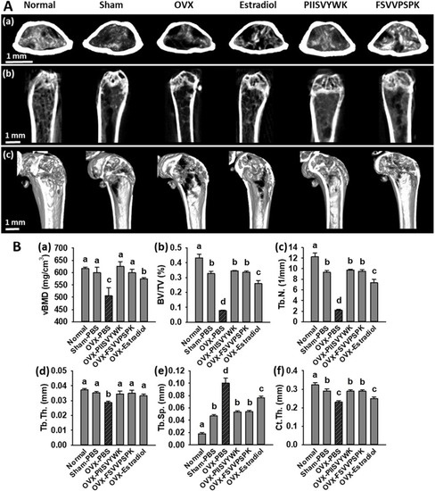 PIISVYWK and FSVVPSPK suppressed bone loss in OVX mice. (A) Micro-CT analysis of the distal femur region, (a) 2D images of cortical bone, (b) 2D images of distal femur, and (c) 3D reconstruction images of distal femur. (B) Analysis of micro-CT quantification of femoral bone parameters in the defined region of interest (ROI), (a) volumetric bone mineral density (vBMD), (b) trabecular bone volume/total volume (BV/TV), (c) trabecular number (Tb.N), (d) trabecular thickness (Tb.Th), (e) trabecular spacing (Tb.Sp), and (f) cortical wall thickness (Ct.Th) performed on the end of femur proximal spongiosa. All data are shown as the mean ± SD (n = 5). a–c Bars with different letters indicate significant difference (p < 0.05).