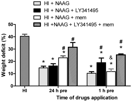 LY341495 applied together with NAAG 24 h before HI did not change the protective effect of NAAG, whereas applied with NAAG 1 h before HI significantly increased the weight deficit of the ipsilateral hemisphere (19% compared to 10% observed for NAAG applied 1 h before HI; p > 0.01, F1,10 = 8). However, we did not observe statistically significant differences in brain weight deficits between groups applied with a mixture of NAAG and LY341495 24 and 1 h before HI. Memantine applied together with NAAG 24 h before HI significantly diminished protective effect of NAAG (weight deficit of ipsilateral hemisphere—23%; p > 0.005, F1,7 = 18.71 compared to NAAG group). The application of memantine together with NAAG 1 h before HI did not change the protective effect of NAAG; however, we did not observe the additive effect of these two compounds either.
