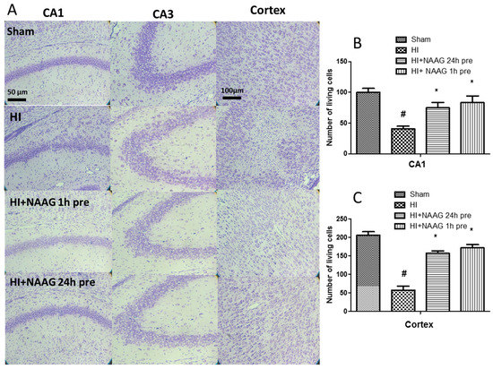 Neuroprotective effect of NAAG application observed in the CA1 and CA3 region of the hippocampus and the cerebral cortex of the ipsilateral hemisphere 7 days after HI (A). Quantification of surviving neurons in (B) the central part of the CA1 region (100 µm in length) and (C) cortex (250 μm × 250 μm area). NAAG was applied i.p. 24 h or 1 h before HI. The microphotographs show the ipsilateral hemisphere. # p < 0.005 compared to sham operated group; * p < 0.05 compared to HI group.