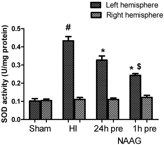 Effect of NAAG application on HI-induced changes in SOD activity. The results are presented as the means ±SEM, n = 6; statistically significant differences: * p < 0.01, compared to the HI group; # p < 0.001 compared to the sham operated group; $ p < 0.01 compared to the NAAG 24 h pre group.