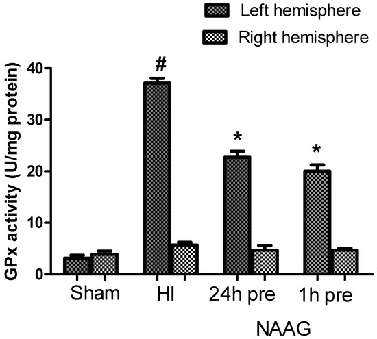 The application of NAAG 24 h before HI and the application of NAAG 1 h before HI significantly decreased GPx activity in ipsilateral hemispheres by 39% (p < 0.001, F1,11 = 92.55) and 46%, (p < 0.001, F1,11 = 126.18), respectively. There was no significant difference between the groups injected with NAAG at the two different time points.