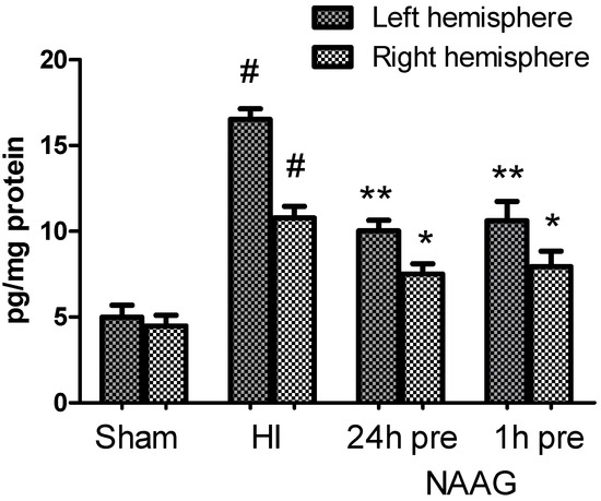 Our investigations showed that HI evoked a significant increase in the TGF-β concentration in both hemispheres, which is in agreement with reports by other authors [61,66]; however, we did not observe any additional increase in the TGF-β concentration in HI groups pretreated with NAAG. The results show that TGF-β concentration, although still higher than that in the control group, was significantly decreased. Therefore, we exclude this process as a part of the mechanism of neuroprotection elicited by NAAG pretreatment.