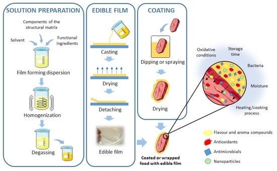 Scheme for the preparation of edible films and coatings and the different bioactive compounds that can be incorporated into them. Adapted from References [31,73].