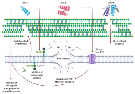 Summary of the mechanisms of action of class I, II, and III bacteriocins. Class I can directly penetrate cell membranes and affect cell integrity using different inhibition pathways. It can bind to lipid II, causing the inhibition of peptidoglycan synthesis and thus, disrupting cell wall formation or inducing pore formation that leads to cell death. In the case of Class II, they can penetrate cell walls and bind to mannose phosphotransferase (Man-PTS) receptors initiating a process of pore formation, as well as penetrate cell membranes and affect cell content by disruption of the proton motive force, among other activities. Class III can act directly on cell walls causing their disruption. Based on References [113,127,128].