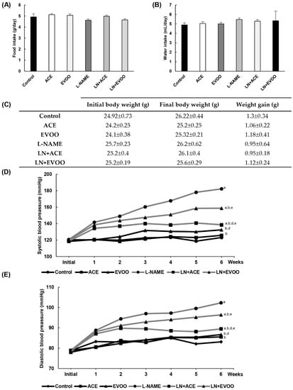 Animal general characteristics. (A) Food intake, (B) water intake and (C) weight gain in experimental animal groups. The weekly progression of (D) systolic blood pressure (SBP) and (E) diastolic blood pressure (DBP) are represented for each animal group. Values are expressed as mean ± SEM of seven animals per group: a p < 0.05 vs. control; b p < 0.05 vs. NG-nitro-L-arginine-methyl-ester (L-NAME); d p < 0.05 vs. L-NAME-induced hypertensive mice supplemented with 12% of EVOO (LN+EVOO); e p < 0.05 vs. ACE.