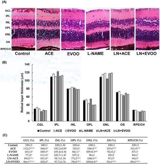 Histomorphometric analyses of retina slides. (A) Representative images of hematoxylin/eosin staining; (B) retinal layer thickness; and (C) percentages of thickness relative to that in the control group. Magnification: 10×. Values are expressed as mean ± SEM of seven animals per group: a p < 0.05 vs. control; b p < 0.05 vs. L-NAME; c p < 0.05 vs. EVOO; d p < 0.05 vs. LN+EVOO; e p < 0.05 vs. ACE. GCL: ganglion cell layer; IPL, inner plexiform layer; INL, inner nuclear layer; OPL, outer plexiform layer; ONL, outer nuclear layer; OS, outer segments; RPE/CH, retinal pigmentary epithelium/choroid.