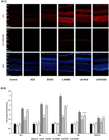 DHE staining showed an intensified signal in L-NAME hypertensive mice compared with the control group at all levels (2.59-, 3.08-, 3.92-, 2.25- and 1.62-fold change in GCL, INL, ONL, OS and RPE/CH, respectively), an alteration that was reversed in hypertensive animals fed with the ACE oil-enriched diet (Figure 3A.1,A.2). On the contrary, the beneficial action of EVOO in this regard was not that evident. In fact, no significant differences were found in GCL, INL and RPE/CH when comparing LN+EVOO and L-NAME groups. The effectiveness of the ACE oil supplementary diet was clearly highlighted in the LN+ACE group, where DHE staining decreased in GCL (121%), INL (144%), ONL (226%), OS (81%) and RPE/CH (42%) in comparison with L-NAME-treated animals. In turn, the LN+EVOO group showed only significant differences in comparison with the L-NAME group in ONL and OS, with respective signal reductions of 120% and 41%. The administration of oil diets to normotensive animals did not affect DHE staining. In any case, the presence of PEG-SOD (Figure 3A.1) resulted in the abolition of O2•− production, thus confirming the specificity of DHE staining.