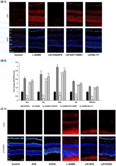 (A.1) Dihydroethidium (DHE) labeling (red color) for reactive oxygen species (ROS) was present in GCL, INL, ONL and OS in the retina, and also in RPE/CH layers, which can be distinguished with 4′,6-diamidino-2-phenylindole (DAPI, blue color) nuclei staining. Middle line photos in the panel represent the effects of preincubation with polyethylene glycol-conjugated superoxide dismutase (PEG-SOD). (A.2) Fluorescence intensity in (A.1) relative to that of control group and quantified using Image J software. (B.1) DHE labeling in retinas from L-NAME-treated mice following preincubation with specific nicotinamide adenine dinucleotide phosphate (NADPH) oxidase (NOX) inhibitors: NOX pan-inhibitor (VAS2870), dual NOX1/NOX4 inhibitor (GKT136901) and NOX1 inhibitor (ML171). (B.2) Relative fluorescence intensity in (B.1) relative to that of control group and quantified using the Image J software. (C.1) Localization/expression of GFAP in retinal layers, with further quantification by measurement of fluorescence intensity and by Western blotting of retinal homogenates (C.2). (D) Nitrosylation of proteins estimated by Western blotting in retinal homogenates. Magnification: 10×. Values are expressed as mean ± SEM of four animals per group: a p < 0.05 vs. control; b p < 0.05 vs. L-NAME; c p < 0.05 vs. EVOO; d p < 0.05 vs. LN+EVOO; e p < 0.05 vs. ACE; * p < 0.05 vs. LN+GKT136901; # p < 0.05 vs. LN+ML171. RFU, relative fluorescence units. GCL, ganglion cell layer; IPL, inner plexiform layer; INL, inner nuclear layer; OPL, outer plexiform layer; ONL, outer nuclear layer; OS, outer segments; RPE/CH, retinal pigmentary epithelium/choroid.