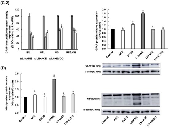 After confirming the overproduction of O2•− in retinal layers of hypertensive mice, glial fibrillary acidic protein (GFAP) was also measured by immunofluorescence as an oxidative stress/inflammatory marker of gliosis (Figure 3C.1). GFAP-specific signals could be detected in the retinal plexiform layers (IPL, OPL), OS and RPE/CH of L-NAME-treated animals, and the staining was significantly lower in LN+ACE and LN+EVOO groups. Specifically, GFAP expression dropped to 55% (IPL), 36% (OPL), 57% (OS) and 57% (RPE/CH) in the LN+ACE group, and respective values for the LN+EVOO group were 36%, 50%, 65% and 50% (Figure 3C.2). No fluorescence signal for GFAP was apparent in the control, ACE and EVOO groups (Figure 3C.1). The quantification of GFAP protein expression in retina homogenates by Western blotting revealed an upregulation (1.8-fold) in hypertensive animals that could be prevented by oil-enriched diets (Figure 3C.2).