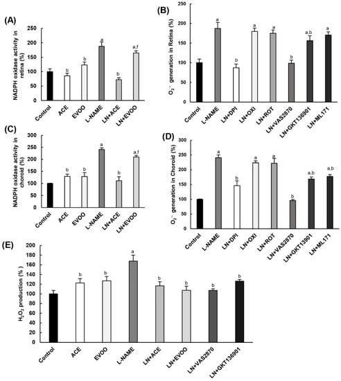 Oxidative stress is highly related to ocular pathologies, including AMD [61] or DR [31]; however, the origin of this oxidative imbalance and the pathways involved in the subsequent development of ocular damage are still under research. Preliminary experiments in our lab brought out an increase in ROS production and NADPH oxidase activity in retinas from L-NAME hypertensive Wistar rats (unpublished observations). In the current study, designed using L-NAME hypertensive C57B/6J mice, similar alterations were observed in both the retina and choroid layers of the eye. The increase in ROS generation in hypertensive mice could be reversed in all retinal layers by the simultaneous administration of ACE oil, whereas the EVOO-enriched diet only mitigated ROS overproduction in ONL and OS layers. These results might be attributable, at least in part, to the higher activity of the enzyme NADPH oxidase, an alteration that was also blocked in retina and choroid homogenates from the L-NAME+ACE group, but not in those from the L-NAME+EVOO group. Previous studies demonstrated a decrease in ROS production in LPS-induced murine peritoneal macrophages incubated with oleocanthal, one of the major secoiridoids present in OOs [62]. Therefore, the changes between ACE oil and EVOO might be due to a higher amount of secoiridoids in the former. Other bioactive minor compounds, such as tocopherols (also elevated in ACE oil over EVOO), might have contributed to better antioxidant outcomes for the ACE oil-enriched diet.