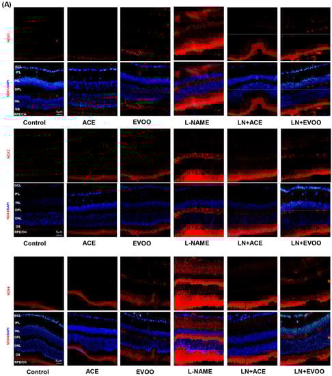 As an additional marker of oxidative stress, the degree of 3-nitrosylation proteins was also measured in retina homogenates by Western blotting (Figure 3D). A significant increase in this parameter was observed in the L-NAME group (2.1-fold change over all other experimental groups). Taken together, all these results suggest an imbalance in the oxidative and inflammatory processes in retinas and RPE/CH from hypertensive mice, which were partly reversed by ACE oil- and EVOO-based diets.