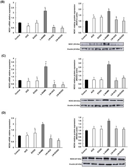 NOX1, NOX2 and NOX4 immunofluorescence signals were significantly higher in L-NAME retinas in comparison with retinas from all other groups, including LN+ACE and LN+EVOO (Figure 5A). NOX1 and NOX4 were detected mainly in GCL, IPL, OPL, OS and RPE/CH, whereas NOX2 expression was only found in OPL, OS and RPE/CH. LN+ACE and LN+EVOO groups apparently showed a similar expression profile in the retina, except for a slightly higher NOX4 signal in the latter. Then, both mRNA and protein expression of NOXs isoforms were quantified in retinal homogenates and the results paralleled those observed in immunofluorescence experiments. An increase in mRNA and protein expression of NOX1 (2.18- and 1.83-fold change, respectively), NOX2 (2.88-/2.83-fold) and NOX4 (1.97-/1.59-fold) was found in retinas from the L-NAME-treated mice group in comparison with retinas from untreated animals (Figure 5B–D). ACE oil and EVOO-supplemented diets reduced the expression of all NOX isoforms in hypertensive animals to a similar extent back to normal values.