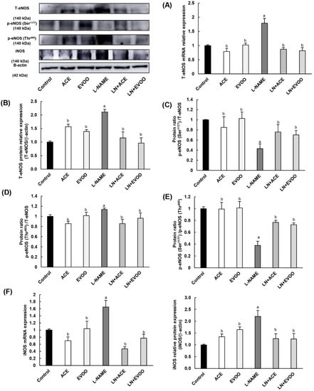 Experiments on NO metabolism and NO synthase (NOS) isoforms revealed a higher gene and protein expression of total endothelial isoform (T-eNOS) in the L-NAME group compared with all other experimental groups (Figure 6A,B). In particular, hypertensive mice showed a decrease in the phosphorylation of eNOS at Ser1177 (which reflects the activation of this enzyme), together with an increase in the phosphorylation at Thr495 (inhibitory phosphorylation) (Figure 6C,D). Consequently, a lower (0.63-fold) ratio of p-eNOS Ser1177/T-eNOS was found in this hypertensive model (Figure 6E). Both ACE oil- and EVOO-enriched diets lead to a similar increase in the ratio of p-eNOS Ser1177/p-eNOS Thr495. Non-hypertensive mice fed oil-enriched diets behaved similarly to the control group. Regarding the inducible (iNOS) isoform, NO-depleted mice showed a significant increase in mRNA and protein expression (1.65- and 2.2-fold change, respectively), which was also reversed by ACE oil and EVOO administration (Figure 6F).