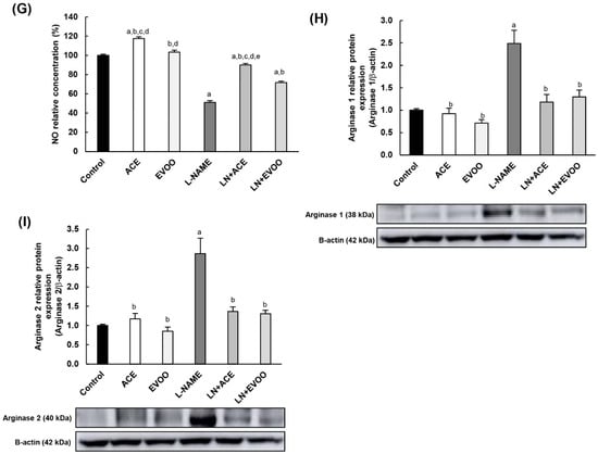 The experimental design was conducted in accordance with the European Union (EU) Directive 2010/63/EU and the national (RD 53/2013) guidelines for the care and use of laboratory animals, and was approved by the competent Institutional Animal Care and Use Committee (approval reference #13/03/2019/031, issued by Junta de Andalucía, Dirección General de Producción Agrícola y Ganadería). Male C57B/6J mice aged 10–12 weeks were obtained from the Center for Animal Production and Experimentation at the University of Seville (Spain). Mice were randomly assigned into six groups of 12 animals each: (1) normotensive mice fed a commercial diet (control group), (2) normotensive mice fed a commercial diet supplemented with 12% (w/w) of wild olive oil (ACE group), (3) normotensive mice supplemented with 12% of extra virgin olive oil (EVOO group), (4) hypertensive mice (via administration of 45 mg L-NAME/kg body weight/day) fed a standard pellet diet (L-NAME group), (5) L-NAME-induced hypertensive mice supplemented with 12% of ACE oil (LN+ACE group); and (6) L-NAME-induced hypertensive mice supplemented with 12% of EVOO (LN+EVOO group). All treatments were maintained for six weeks; during this period, food and water intake were continuously monitored. All animals were housed in a regulated environment under standard conditions (23 ± 1 °C, 12 h/12 h light/dark cycles). Upon harvesting, animal samples were collected as described below and assigned to different experiments, as specified in Figure captions.
