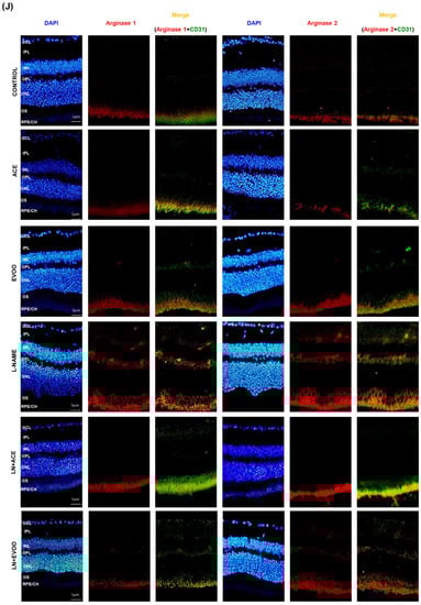 NO concentration in retinal homogenates was reduced by 50% in L-NAME-treated animals; this alteration was corrected by oil supplementation, with a higher effect in favor of ACE oil-enriched diets compared to EVOO (Figure 6G). To further deepen NO metabolism, the location and protein expression of arginase enzyme isoforms 1 (Arg-1) and 2 (Arg-2), which are commissioned in L-arginine (NOS substrate) degradation, are depicted in Figure 6H–J. Both isoforms of this hydrolytic enzyme were overexpressed in the L-NAME group (2.42- and 2.87-fold change, respectively), and values returned to normal in both LN+ACE and LN+EVOO groups (Figure 6H,I). In addition, hypertensive animals presented with an overexpression of arginase isoforms in RPE/CH, OS, OPL and at the boundary GCL/IPL. Simultaneous dietary supplementation with oils revealed immunofluorescence signals in RPE/CH and OS, with a lower intensity than that observed in hypertensive mice subjected to the standard diet. In addition, LN+EVOO and EVOO groups showed a faint Arg-1/2 expression in OPL, an observation that was not reproduced in ACE or LN+ACE retinas. Experiments performed with an endothelial marker (anti-CD31) confirmed that arginase expression correlated with endothelial retinal cells, since the immunofluorescence signal from arginases merged with that from CD31 (yellow color in Figure 6J).