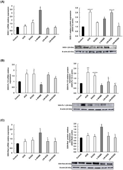 The antioxidant enzyme expression at mRNA and protein levels is shown in Figure 7. Both superoxide dismutase (SOD-1) and glutathione reductase (GSH-Red) displayed a significant upregulation (3.41- and 1.77-fold for SOD-1 gene/protein expression, respectively; and 2.15-/1.77-fold for GSH-Red) in mice subjected to L-NAME treatment compared to the control group (Figure 7A,C). Oil-enriched diets reversed these values back to those observed in control normotensive mice, with the sole exception of SOD-1 protein expression of in LN+ACE, in which values were almost 2.5 times higher than those observed in control animals. On the other hand, the glutathione peroxidase (GSH-Px) enzyme was downregulated in the L-NAME group at both mRNA (0.73-fold change) and protein (0.79-fold change) levels compared with the control group (Figure 7B), an alteration that was mitigated in hypertensive animals treated simultaneously with experimental oils.