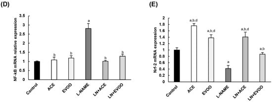 Due the relevance of nuclear factor kappa-B (NF-kB) and nuclear factor erythroid-2 (Nrf-2) transcription factors as regulators of oxidative imbalance/inflammation related to NADPH oxidase and NOS pathways, their gene expression was also determined and measured by RT-qPCR. Overexpression of NF-kB (2.81-fold change over control group) was detected in the L-NAME group and reversed via simultaneous administration of oils (Figure 7D). On the contrary, Figure 7E depicts the observed downregulation of Nrf-2 in hypertensive animals (0.42-fold change), with a reversal action represented by ACE (1.76-fold over control group) and LN+ACE (1.41-fold) groups.