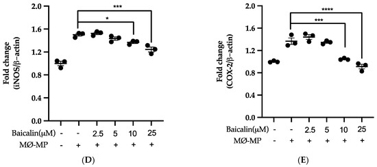 Firstly, we evaluated the RAW264.7 cell viability after treatment with various doses of baicalin and MØ-MP. As shown in Figure 2A, baicalin, at a dose of up to 25 µM, did not alter the RAW264.7 cell viability compared to normal (baicalin untreated group). Figure 2B shows the efficacy of baicalin to inhibit the NO production in MØ-MP induced RAW264.7 cells, whereas Figure 2C–E shows the potency of baicalin to reduce the protein expression of iNOS and COX-2.