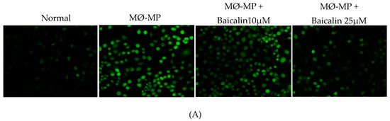 a. Measurement of ROS by fluorescence intensity quantification: RAW264.7 cells, EC, VSMC were cultured in black 96-well plate. Cells were treated with or without a various dose of baicalin and 10 μg/mL protein equivalent of MØ-MP (for RAW264.7), 10 μg/mL protein equivalent of EC-MP (for EC), and 10 μg/mL protein equivalent of VSMC-MP (for VSMC) for 4 h. An amount of 10 μM of 2′,7′-dihydrodichlorofluorescin diacetate was added for 60 min in the dark. Cells were washed with PBS, and fluorescence intensity was measured at excitation 485 nm and emission 527 nm [28,29,30].