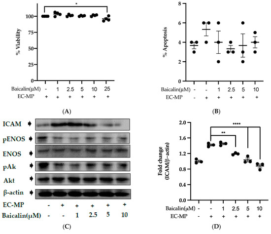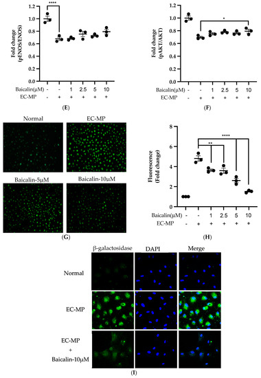 Firstly, we evaluated the EC cell viability by the treatment of various doses of baicalin and EC-MP. As shown in Figure 4A, baicalin, at a dose up to 10 µM, did not alter the EC viability compared to normal (baicalin untreated group). Similarly, Figure 4B shows the results of EC-MP induced EC apoptosis. Although EC-MP slightly increases the apoptosis of EC, baicalin slightly decreases the apoptosis of EC, however, there was no statistically significant difference. Endothelial dysfunction results in altered protein expression by EC. As shown in Figure 4C, the protein expression of ICAM was increased, whereas pENOS and pAKT were decreased by EC-MP treatment. In contrast, baicalin treatment results in a significant decrease in protein expression of ICAM and a slight increase in pAKT but no significant difference in pENOS expression (Figure 4D–F). Similarly, the production of ROS in response to EC-MP was increased in EC, while baicalin dose-dependently inhibited the ROS generation (Figure 4G,H). Likewise, EC-MP induced the senescence of EC as revealed by an increase in senescence induced β-galactosidase positive fluorescence staining while baicalin at a dose of 10 μM significantly decrease the β-galactosidase staining (Figure 4I)