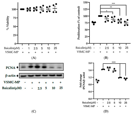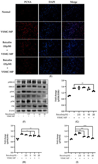 Initially, we evaluated the VSMC cell viability by treatment of various doses of baicalin along with VSMC-MP. As shown in Figure 5A, baicalin, at a dose up to 25 µM did not alter the VSMC viability as compared to normal (baicalin untreated group). VSMC-MP cause approximately 25% more proliferation of VSMC than the normal group (VSMC-MP untreated). However, baicalin inhibited the proliferation of VSMC in a dose-dependent manner (Figure 5b). Consistently, the increase in PCNA expression (a marker of VSMC proliferation) by VSMC-MP was inhibited by baicalin in both Western blot (Figure 5C,D) and immunofluorescence experiments (Figure 5E). The overexpression of MAPK signaling pathway proteins is responsible for VSMC proliferation [24]. As shown in Figure 5F, the increase in MAPK protein expression-induced VSMC-MP was inhibited with baicalin treatment. There was a dose-dependent inhibition of pERK 1/2 (Figure 6G), pJNK (Figure 6H), and pP38 (Figure 6I) by baicalin.