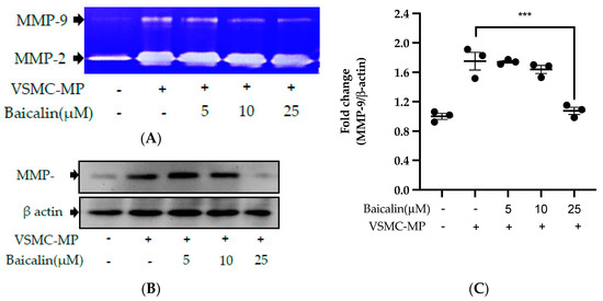 VSMC, seeded at the concentration of 5 × 105 cells in a 60 mm dish, were starved in 0.4% FBS/DMEM for 24 h. Then, baicalin was treated at a different concentration for 1 h, followed by stimulation with 10 μg/mL of VSMC-MP for 24 h. The conditioned medium of cells was subjected to gelatin zymography to detect MMPs enzymatic activity as described previously [24,35].