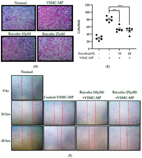 Effect of baicalin on VSMC-MP induced VSMC migration. VSMC were incubated with or without VSMC-MP and baicalin for 24 h. (A) Cell supernatant media was subjected to gelatin zymography for the detection of MMP enzymatic activity. (B) Cell lysate was subject to Western blot for protein expression of MMP-9. β-actin was used for normalization. (C) Quantitative data of MMP-9-fold change. (D) VSMCs were induced to migrate through the gelatin membrane barrier in the presence of baicalin and VSMC-MP for 48 h. Images of migrated VSMC were taken after H/E staining (20× magnification). (E) The cells on the outer layer after migration were counted in five random positions under the high-power field (HPF). (F) The monolayer of confluent VSMC was scratched to create a migrating zone. Photographs were taken at time 0. Then, baicalin was treated at the concentrations of 10 and 25 µM for up to 48 h in the presence of VSMC-MP. Photographs were taken at 24 h and 48 h (20× magnification). Each value is the mean ± SE of three to five independent experiments, and each independent experiment contains five replicates. ***p < 0.001, ****p < 0.0001 vs. control (VSMC-MP alone). The analysis was performed by one-way ANOVA followed by Dunnett multiple comparison test.