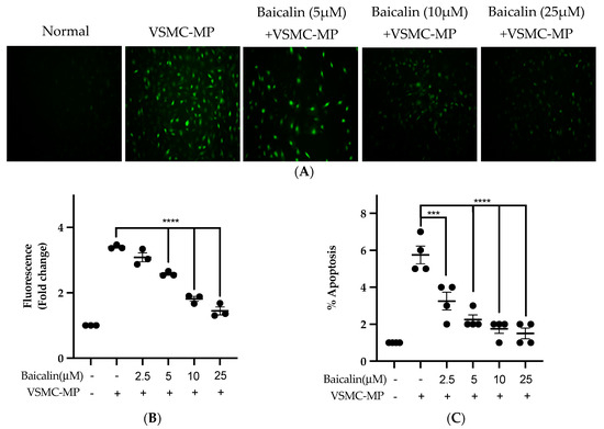 Figure 7A shows the activity of baicalin to inhibit ROS production in VSMC-MP-induced VSMC. There was a 4.5-fold increase in ROS production after SMC-MP treatment as compared to the normal group, whereas baicalin dose-dependently reduced the cellular ROS level (Figure 7B). Similarly, the apoptosis of VSMC was increased 5.5-fold, while baicalin treatment decreases the VSMC apoptosis rate (Figure 7C).