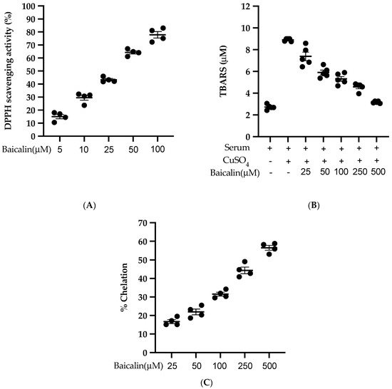 Baicalin scavenges the DPPH free radical in a dose-dependent manner with an IC50 of 27.21 µM (Figure 8A). Similarly, baicalin also inhibits the lipid peroxidation induced by CuSO4 with an IC50 of 95.09 µM. (Figure 8B). Likewise, baicalin possesses significant metal-chelating potency with an IC50 of 352.04 µM (Figure 8C). This potent antioxidant potency of baicalin could be the possible reason to inhibit the ROS formation in all three cell lines (VSMC, EC, MØ) in vitro.