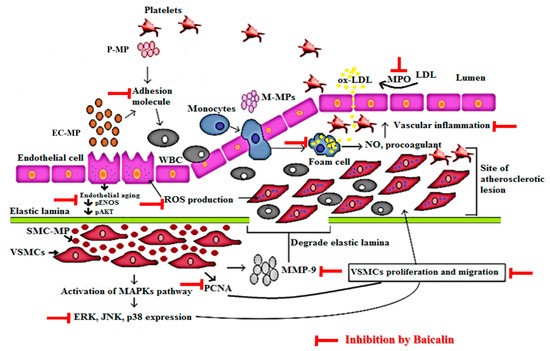 Mechanism of vascular inflammation mediated by microparticles and target of baicalin. Endothelial cell (EC), vascular smooth muscle cell (VSMC), and macrophage cell activation in response to various stimuli such as ROS, LPS, tumor necrosis factor (TNF)-α, interleukin (IL) lead to the production of endothelial microparticle (EC-MP), smooth muscle cell-microparticles (VSMC-MP) and macrophage microparticles (MØ-MP) respectively. EC-MP increases the ROS production in EC, thereby reduce phosphorylated ENOS and Akt expression followed by a decrease in nitric oxide (NO) production (a potent vasorelaxant). VSMC-MP stimulates VSMC to express matrix metalloproteinase-9 (MMP-9), leading to the degradation of the elastic lamina barrier and ease VSMC migration to the site of the atherosclerotic lesion. Furthermore, VSMC-MP also upregulates the mitogen-activated protein kinase pathway (MAPK) (ERK, JNK, P38) pathway and PCNA protein expression leading to proliferation and migration of VSMC to develop vascular inflammation. EC-MP and platelet microparticles (PMPs) possesses cell adhesion molecules that support the adhesion of various circulating cell the endothelial cell followed by altered intimal permeability and vascular lesion at a later stage. MØ-MP activated macrophage to uptake oxidized LDL and change in foam cell. This activated form of macrophage is responsible for the overexpression of nitric oxide (NO) and the procoagulant factor causing vascular inflammation. As a whole, all of this pathway leads to atherosclerosis. The target of baicalin to inhibit vascular inflammation is shown by the red line.