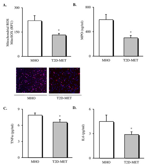 Evaluation of systemic oxidative stress markers and cytokines in the serum of MHO and obese T2D patients treated with metformin. Levels of mitochondrial ROS production (A) expressed as arbitrary units and the representative images of their leukocytes stained with MitoSox (red) and Hoechst 33,342 (blue) and visualized by fluorescence microscopy (n = 20 in MHO and n = 17 in T2D-Met), serum levels of (B) MPO (n = 11 in MHO and n = 16 in T2D-Met), (C) TNFα (n = 14 in MHO and n = 15 in T2D-Met) and (D) IL6 (n = 12 in MHO and n = 15 in T2D-Met). Data are expressed as mean + standard error. * p < 0.05 when compared using unpaired Student’s t-test. ROS, reactive oxygen species; RFU, relative fluorescence units; MPO, myeloperoxidase; IL6, interleukin 6; TNFα, tumor necrosis factor alpha; MHO, metabolically healthy obese; T2D-Met, type 2 diabetic patients treated with metformin.