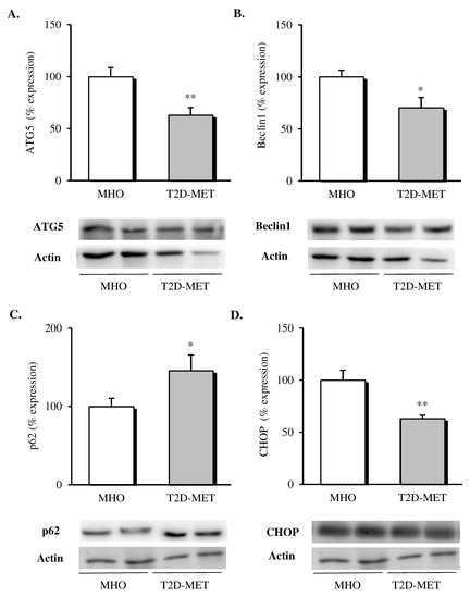 Evaluation of autophagy mediators and CHOP in the VAT of MHO and obese T2D patients treated with metformin. Relative protein expression and representative western blot images of (A) ATG5 (n = 12 in MHO and n = 13 in T2D-Met), (B) Beclin1 (n = 12 in MHO and n = 13 in T2D-Met), (C) p62 (n = 12 in MHO and n = 11 in T2D-Met) and proapoptotic marker (D) CHOP (n = 12 in MHO and n = 10 in T2D-Met). Data are expressed as mean + standard error. * p < 0.05 and ** p < 0.01 when compared using unpaired Student’s t-test. CHOP, CCAAT/enhancer-binding protein (C/EBP) homologous protein; VAT, visceral adipose tissue; MHO, metabolically healthy obese; T2D-Met, type 2 diabetic patients treated with metformin; ATG5, autophagy related 5.