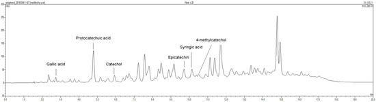 Ribes diacanthum Pall was obtained from Mongolia in the Khentii Mountains located in the northern regions of Mongolia. RDP was prepared according to a method in a previous report [30]. Briefly, the dried and lyophilized Ribes diacanthum Pall (3 kg) was extracted with 6 L of 80% methanol in a sonicator bath for 3 days. The extract with 80% methanol was filtered by Whatman No. 2 filter paper (Whatman International Limited, Kent, UK). The above process was repeated 3 times. The whole mixture by filtering was concentrated using a rotary evaporator (N11, Yamato Co., Tokyo, Japan). The concentrate was dissolved in distilled water, added to ethyl acetate (1:1, v/v), and partitioned in a separatory funnel. The fraction was evaporated and concentrated in a rotary evaporator at temperatures under 40 °C (yield, 41 g). The total phenolic compounds and flavonoid contents in RDP were 0.488 mg/mL and 0.995 mg/mL, respectively [26]. In a previous report, as shown in Figure 1, we showed that RDP contained six polyphenolic substances, including gallic acid (6.28 mg/100 g) at 2.731 min, protocatechuic acid (121.96 mg/100 g) at 4.783 min, catechol (30.86 mg/100 g) at 5.926 min, epicatechin (92.31 mg/100 g) at 9.711 min, syringic acid (19.14 mg/100 g) at 10.137 min, and 4-methyl catechol (4.55 mg/100 g) at 10.731 min, respectively, by performing HPLC with each standard [30]. The extract was diluted 20-times with diluted solution (KH2PO4:MeOH:D.W = 2:3:15), and the diluted solution was filtered b a 0.45 μm syringe filter. The filtered samples were analyzed using HPLC (Thermo Fisher UltiMate 3000, Thermo Scientific, Bremen, Germany), and Eclipse XDB-C18 column (150 × 4.6 mm, 5 μm, Agilent Technologies, Wilmington, DE, USA) at 40 °C. 3% Acetic acid was used as the HPLC mobile phase, and the detector was monitored to a wavelength of 280 nm and a flow rate of 1.0 mL/min, where 10 μL of the samples were injected and analyzed. The standard calibration curve was measured by the following as standards: gallic acid, protocatechuic acid, catechol, catechin, chlorogenic acid, epigallocatechin gallate, caffeic acid, epicatechin, syringic acid, 4-methycatechol, epicatechin gallate, p-coumaric acid, ferulic acid, and rutin. The content was expressed as mg/100 g FW. The sample was stored at −20 °C until used.